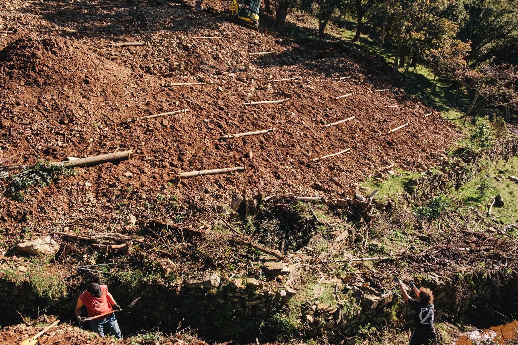 7,000 plants will be introduced across these zones, creating a biodiverse and sustainable ecosystem. Work began in September 2024, with terrace leveling, retention barrier installation using eucalyptus wood, and selective tree removal to respect the ecological balance.
